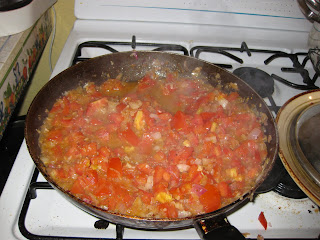 Fry the bacon wrapped shrimp until a little crispy in a large saute pan. Once they are brown on all sides transfer to a dish to drain. In the same pan saute onion, red onion, garlic, and tomatoes. We used 1 whole red onion, 1 small white onion, 1 small head of garlic, and 8 or so tomatoes. In the Rachel Ray one they used the little cherry ones and put them in and let them burst open. We seasoned with salt, pepper, oregano, italian seasoning & Pappy's. I went the my little herb pots ad grabbed a bunch of basil leaves and parsley leaves and threw them in at the last minute.
